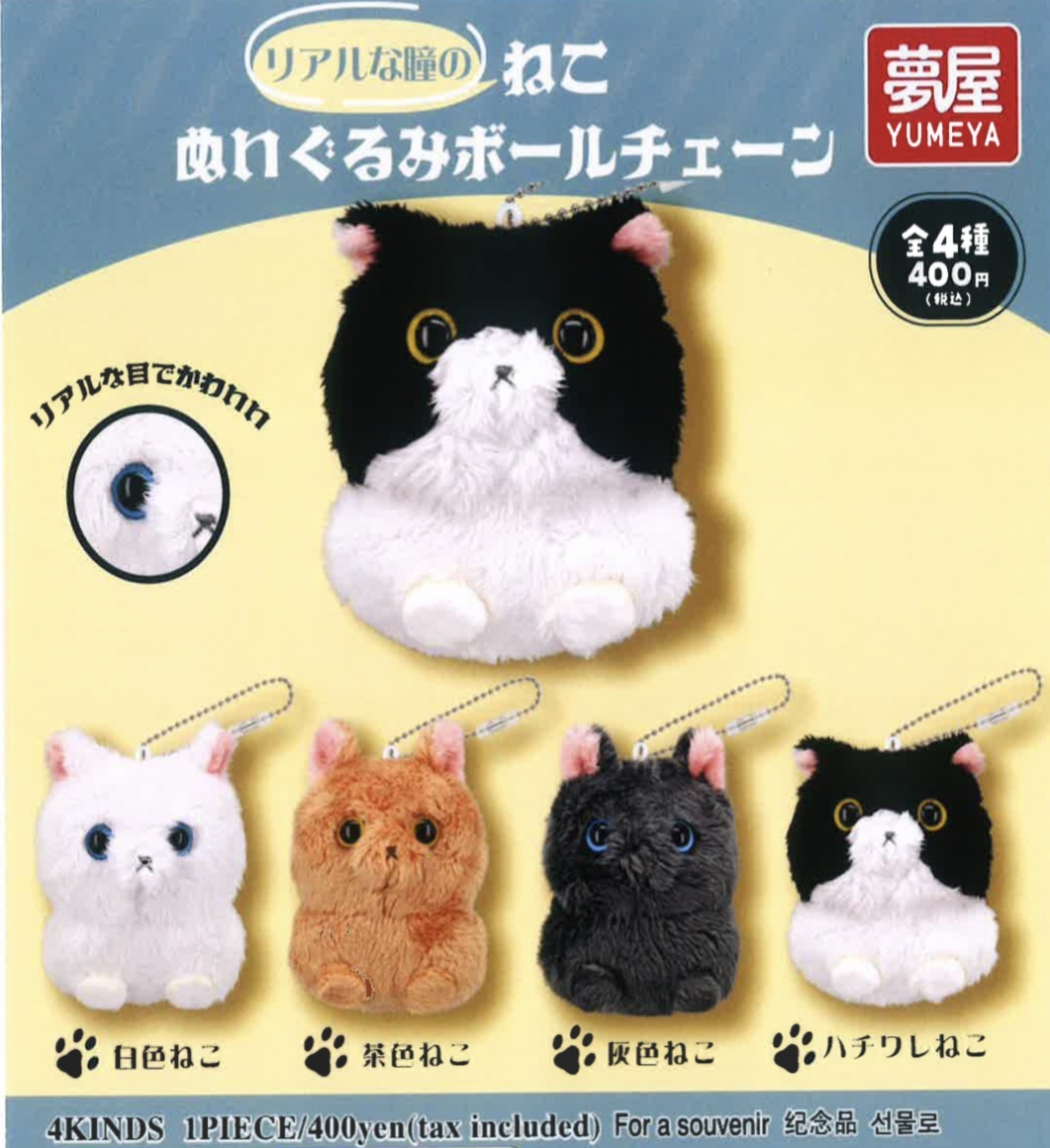 御予約受付中 | 発売予定 | 1月発売 | メーカー | 夢屋 | 商品名 | リアルな瞳のねこぬいぐるみボールチェーン (全4種) | 仕様 | 400円カプセルトイ | 入り数 | 30個入り | カプセルサイズ | 65mm | JANコード | | 内容 | 受注締切日:2025年10月10日(金)午前7時【AM】になります。お早目のご予約お願いいたします! 400円カプセル。 こちらの商品は、商品入荷時の1袋30個+正規台紙1枚、29%OFF¥12000→¥8520での販売となります。