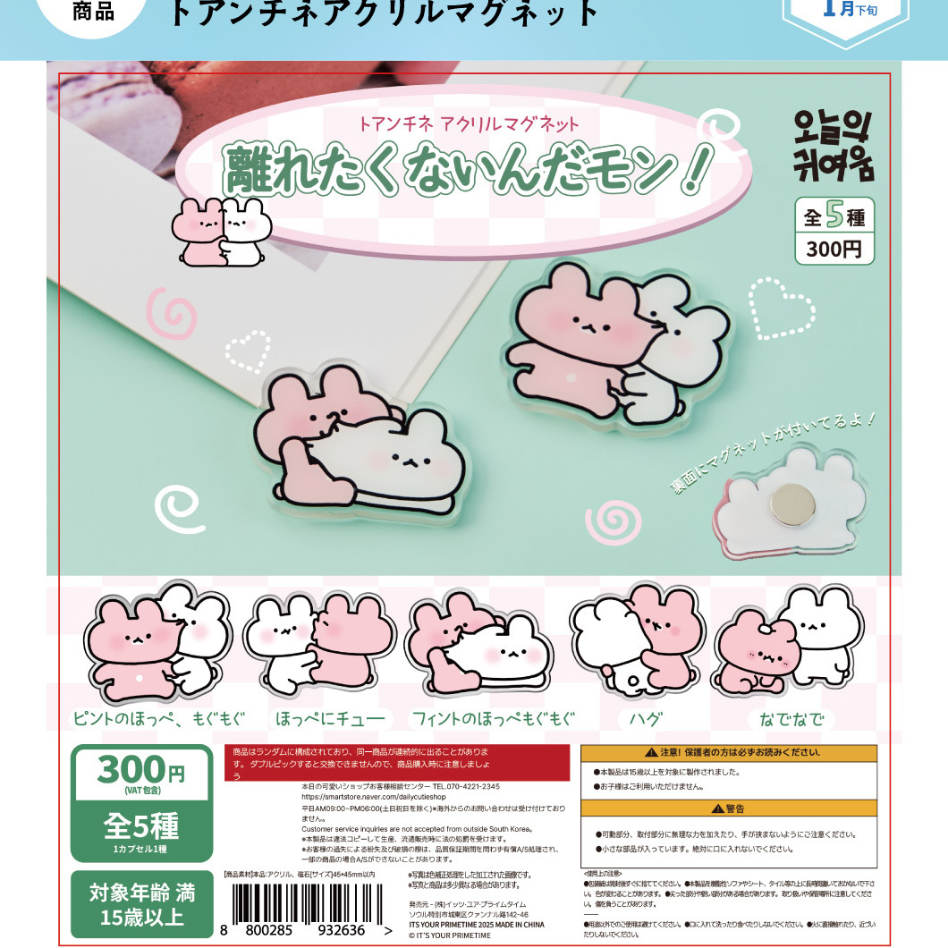 御予約受付中 | 発売予定 | 1月発売 | メーカー | It's Your Primetime Inc.(韓国メーカー) | 商品名 | 【離れたくないんだモン!】トアンチネアクリルマグネット (全5種) | 仕様 | 300円カプセルトイ | 入り数 | 40個入り | カプセルサイズ | | JANコード | | 内容 | 受注締切日:2025年10月10日(金)午前7時【AM】になります。お早目のご予約お願いいたします! 300円カプセル。 こちらの商品は、商品入荷時の1袋40個+正規台紙1枚、25%OFF¥12000→¥8999での販売となります。