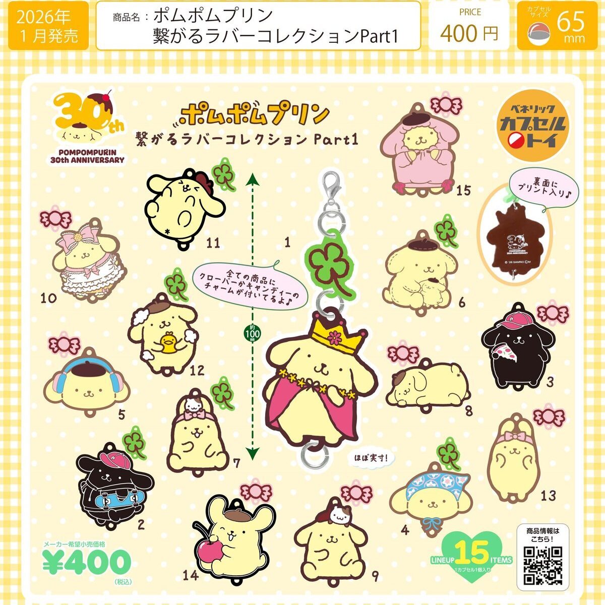 御予約受付中 | 発売予定 | 1月発売 | メーカー | ベネリック | 商品名 | ポムポムプリン 繋がるラバーコレクションPart1 (全15種) | 仕様 | 400円カプセルトイ | 入り数 | 30個入り | カプセルサイズ | 65mm | JANコード | | 内容 | 受注締切日:2025年10月10日(金)午前7時【AM】になります。お早目のご予約お願いいたします! 400円カプセル。 こちらの商品は、商品入荷時の1袋30個+正規台紙1枚、20%OFF¥12000→¥9599での販売となります。