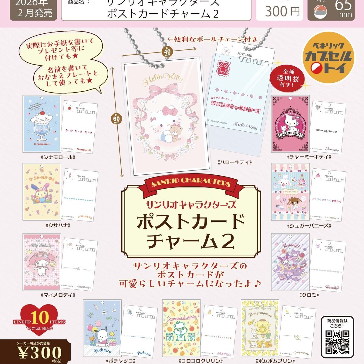 御予約受付中 | 発売予定 | 2月発売 | メーカー | ベネリック | 商品名 | サンリオキャラクターズ ポストカードチャーム2 (全10種) | 仕様 | 300円カプセルトイ | 入り数 | 40個入り | カプセルサイズ | 65mm | JANコード | | 内容 | 受注締切日:2025年10月10日(金)午前7時【AM】になります。お早目のご予約お願いいたします! 300円カプセル。 こちらの商品は、商品入荷時の1袋40個+正規台紙1枚、20%OFF¥12000→¥9599での販売となります。