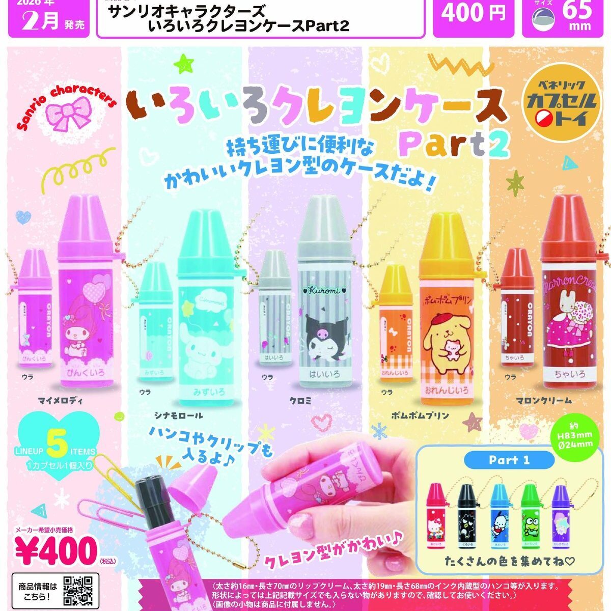 御予約受付中 | 発売予定 | 2月発売 | メーカー | ベネリック | 商品名 | サンリオキャラクターズ いろいろクレヨンケースPart2 (全5種) | 仕様 | 400円カプセルトイ | 入り数 | 30個入り | カプセルサイズ | 65mm | JANコード | | 内容 | 受注締切日:2025年10月10日(金)午前7時【AM】になります。お早目のご予約お願いいたします! 400円カプセル。 こちらの商品は、商品入荷時の1袋30個+正規台紙1枚、20%OFF¥12000→¥9599での販売となります。