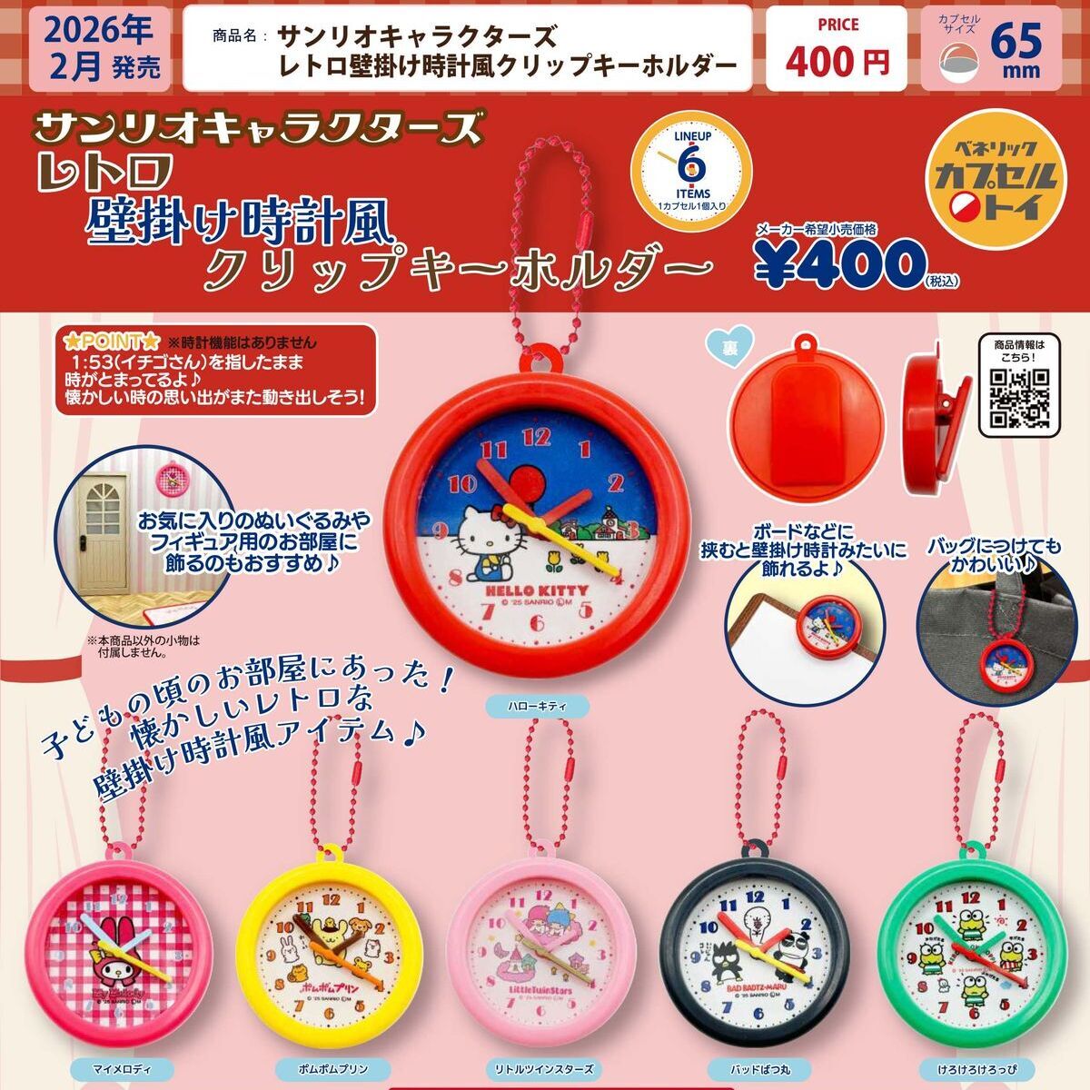 御予約受付中 | 発売予定 | 2月発売 | メーカー | ベネリック | 商品名 | サンリオキャラクターズ レトロ壁掛け時計風クリップキーホルダー (全6種) | 仕様 | 400円カプセルトイ | 入り数 | 30個入り | カプセルサイズ | 65mm | JANコード | | 内容 | 受注締切日:2025年10月10日(金)午前7時【AM】になります。お早目のご予約お願いいたします! 400円カプセル。 こちらの商品は、商品入荷時の1袋30個+正規台紙1枚、20%OFF¥12000→¥9599での販売となります。