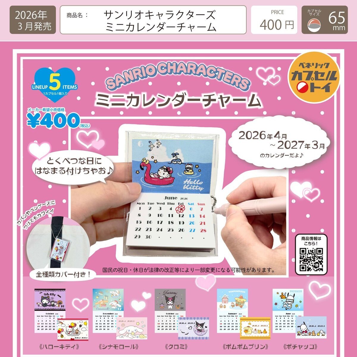 御予約受付中 | 発売予定 | 3月発売 | メーカー | ベネリック | 商品名 | サンリオキャラクターズ ミニカレンダーチャーム (全5種) | 仕様 | 400円カプセルトイ | 入り数 | 30個入り | カプセルサイズ | 65mm | JANコード | | 内容 | 受注締切日:2025年10月10日(金)午前7時【AM】になります。お早目のご予約お願いいたします! 400円カプセル。 こちらの商品は、商品入荷時の1袋30個+正規台紙1枚、20%OFF¥12000→¥9599での販売となります。