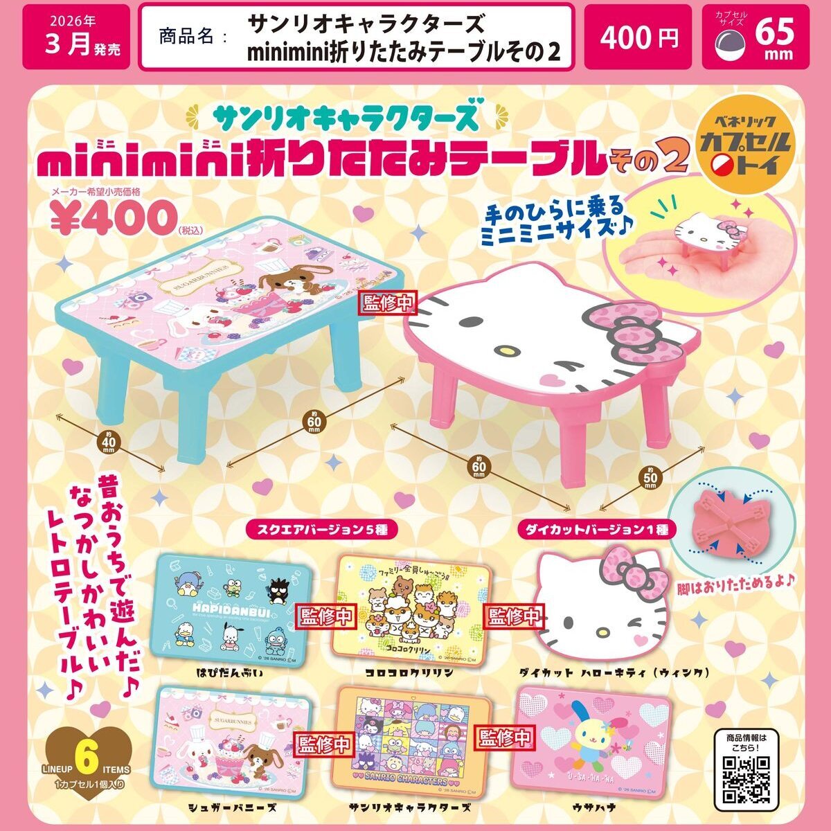 御予約受付中 | 発売予定 | 3月発売 | メーカー | ベネリック | 商品名 | サンリオキャラクターズ minimini折りたたみテーブルその2 (全6種) | 仕様 | 400円カプセルトイ | 入り数 | 30個入り | カプセルサイズ | 65mm | JANコード | | 内容 | 受注締切日:2025年10月10日(金)午前7時【AM】になります。お早目のご予約お願いいたします! 400円カプセル。 こちらの商品は、商品入荷時の1袋30個+正規台紙1枚、20%OFF¥12000→¥9599での販売となります。