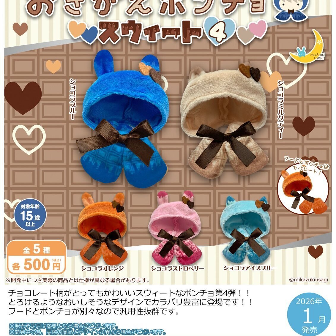 御予約受付中 | 発売予定 | 1月発売 | メーカー | 三日月うさぎ(株)さくら | 商品名 | おきがえポンチョ スウィート4 (全4種) | 仕様 | 500円カプセルトイ | 入り数 | 20個入り | カプセルサイズ | 65mm | JANコード | | 内容 | 受注締切日:2025年10月10日(金)午前7時【AM】になります。お早目のご予約お願いいたします! 500円カプセル。 こちらの商品は、商品入荷時の1袋20個+正規台紙1枚、28%OFF¥10000→¥7199での販売となります。 ※カプセルトイ ガチャガチャ ガシャポン ガチャポン