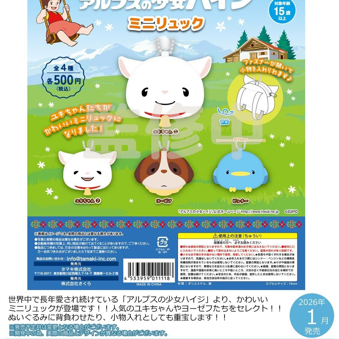 御予約受付中 | 発売予定 | 1月発売 | メーカー | 三日月うさぎ(株)さくら | 商品名 | アルプスの少女ハイジ ミニリュック (全4種) | 仕様 | 500円カプセルトイ | 入り数 | 20個入り | カプセルサイズ | 74mm | JANコード | | 内容 | 受注締切日:2025年10月10日(金)午前7時【AM】になります。お早目のご予約お願いいたします! 500円カプセル。 こちらの商品は、商品入荷時の1袋20個+正規台紙1枚、28%OFF¥10000→¥7199での販売となります。 ※カプセルトイ ガチャガチャ ガシャポン ガチャポン