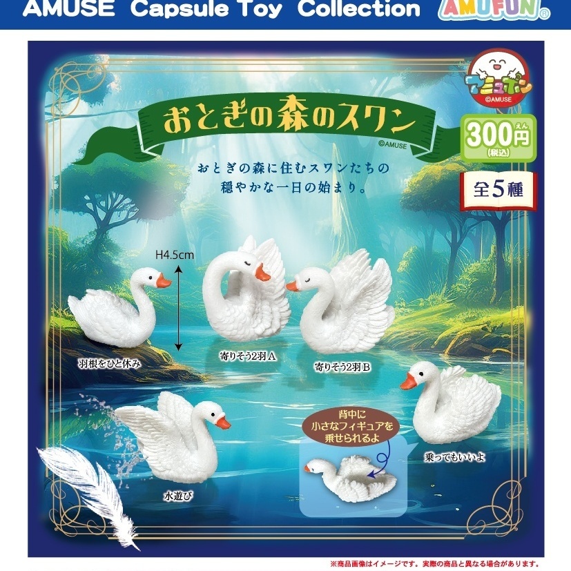 御予約受付中 | 発売予定 | 2月発売 | メーカー | アミューズ | 商品名 | おとぎの森のスワン (全5種) | 仕様 | 300円カプセルトイ | 入り数 | 40個入り | カプセルサイズ | | JANコード | | 内容 | 受注締切日:2025年11月11日(火)午前7時になります。お早目のご予約お願いいたします! 300円カプセル。 こちらの商品は、商品入荷時の1袋40個+正規台紙1枚、29%OFF¥12000→¥8579での販売となります。