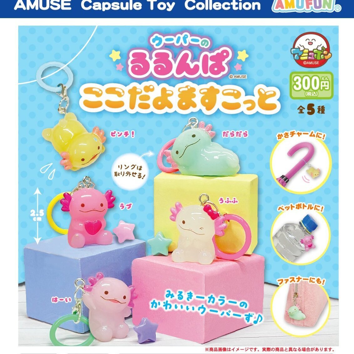御予約受付中 | 発売予定 | 3月発売 | メーカー | アミューズ | 商品名 | ウーパーのるるんぱここだよマスコット (全5種) | 仕様 | 300円カプセルトイ | 入り数 | 40個入り | カプセルサイズ | | JANコード | | 内容 | 受注締切日:2025年11月11日(火)午前7時になります。お早目のご予約お願いいたします! 300円カプセル。 こちらの商品は、商品入荷時の1袋40個+正規台紙1枚、29%OFF¥12000→¥8579での販売となります。