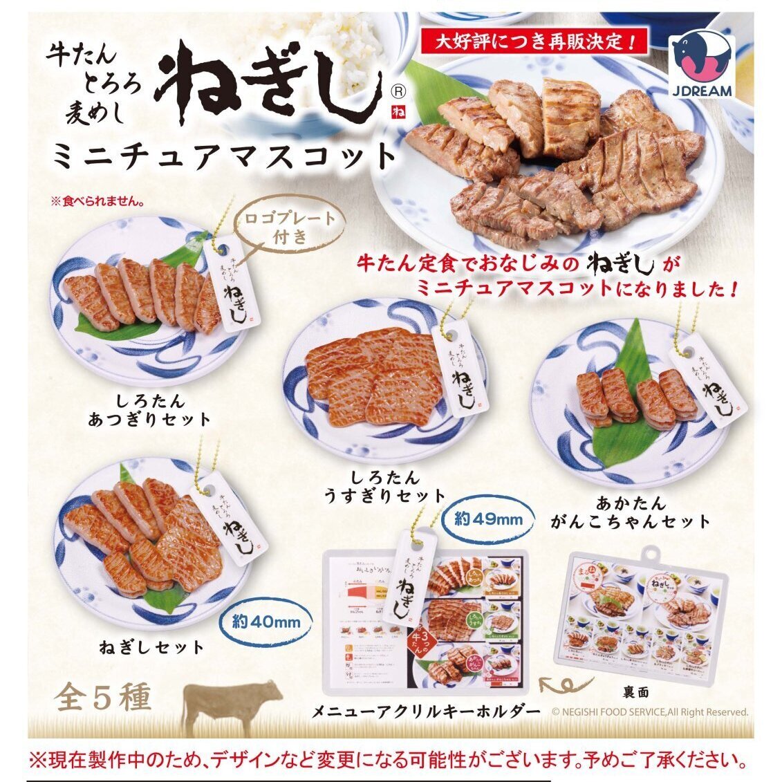 | | 内容 | 受注締切日:2025年11月11日(火)午前7時【AM】になります。お早目のご予約お願いいたします! 400円カプセル。 牛たん定食でおなじみのねぎしがミニチュアマスコットになりました! 全5種類 ・しろたん あつぎりセット ・しろたん うすぎりセット ・あかたん がんこちゃんセット ・ねぎしセット ・メニューアクリルキーホルダー こちらの商品は、商品入荷時の1袋30個+正規台紙1枚、25%OFF¥12000→¥8999での販売となります。 ※カプセルトイ ガチャガチャ ガシャポン ガチャポン