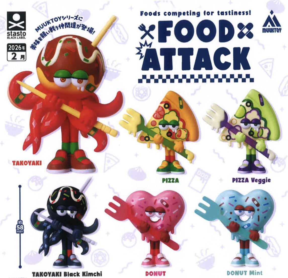 | 御予約受付中 | | 発売予定 | 2月発売 | | メーカー | スタンド・ストーンズ | | 商品名 | フードアタック (全6種) | | 仕様 | 400円カプセルトイ | | 入り数 | 30個入り | | カプセルサイズ | | | JANコード | | | 内容 | 受注締切日:2025年11月11日(火)午前7時【AM】になります。お早目のご予約お願いいたします! 400円カプセル。 約58mm。 全6種類 ・TAKOYAKI ・PIZZA ・DONUT ・TAKOYAKI Black Kimchi ・PIZZA Veggie ・DONUT Mint こちらの商品は、商品入荷時の1袋30個+正規台紙1枚、25%OFF¥12000→¥8999での販売となります。