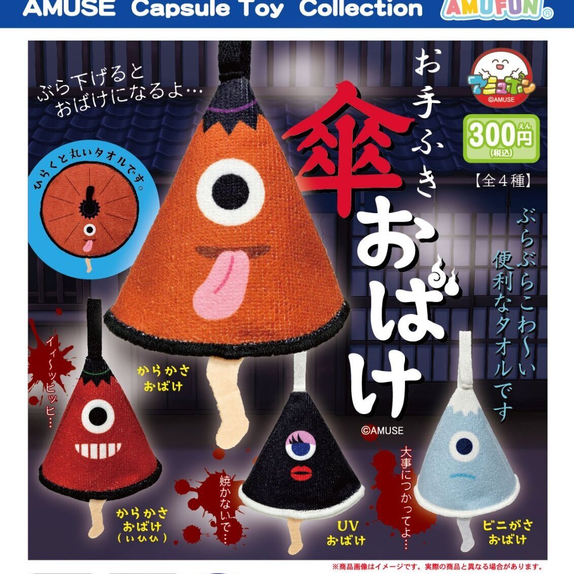 | 御予約受付中 | | 発売予定 | 4月発売 | | メーカー | アミューズ | | 商品名 | お手ふき傘おばけ(再販) (全4種) | | 仕様 | 300円カプセルトイ | | 入り数 | 40個入り | | カプセルサイズ | | | JANコード | | | 内容 | 受注締切日:2025年12月11日(木)午前7時になります。お早目のご予約お願いいたします! 300円カプセル。 こちらの商品は、商品入荷時の1袋40個+正規台紙1枚、29%OFF¥12000→¥8579での販売となります。