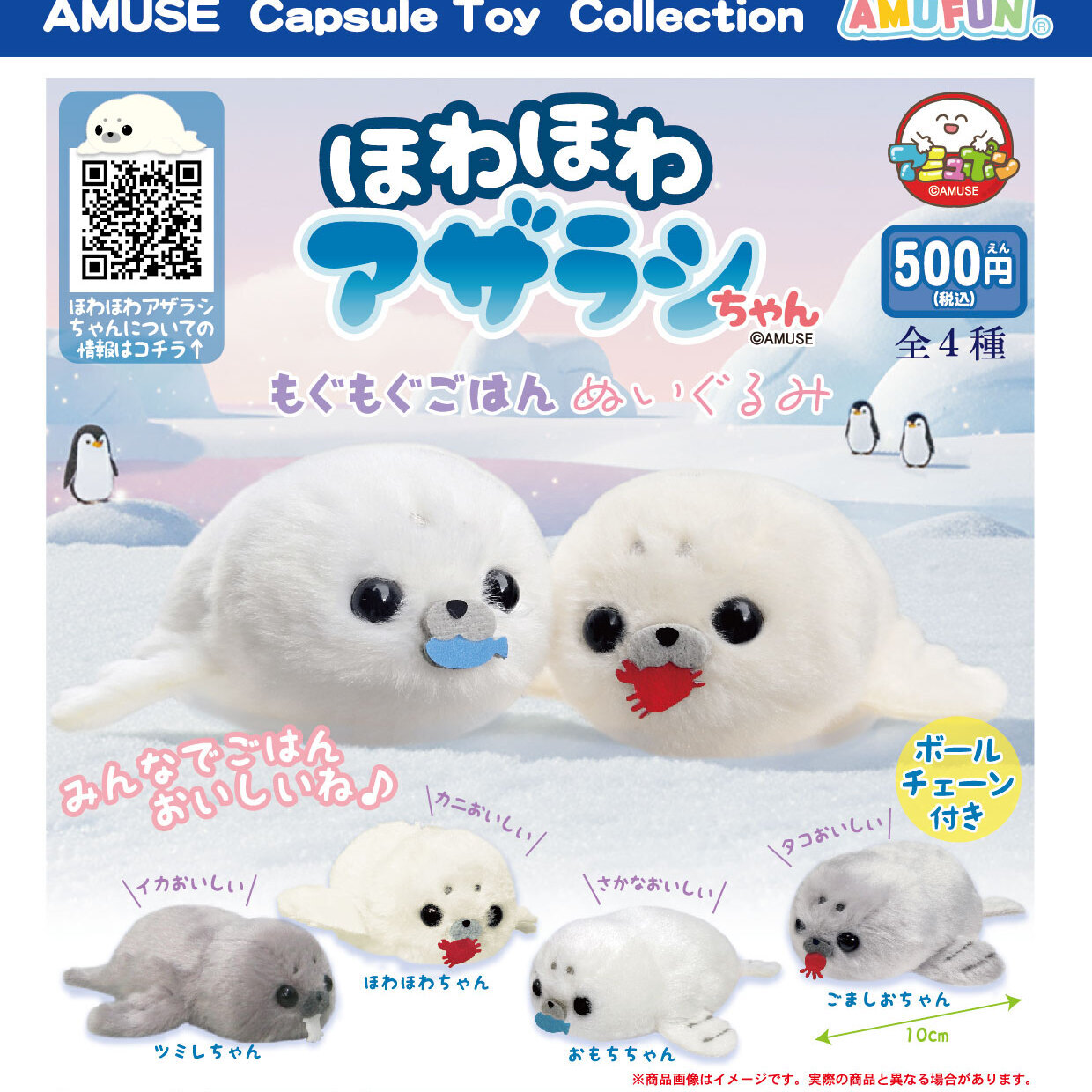| 御予約受付中 | | 発売予定 | 4月発売 | | メーカー | アミューズ | | 商品名 | ほわほわアザラシちゃんもぐもぐごはんぬいぐるみ (全4種) | | 仕様 | 500円カプセルトイ | | 入り数 | 20個入り | | カプセルサイズ | | | JANコード | | | 内容 | 受注締切日:2025年12月11日(木)午前7時【AM】になります。お早目のご予約お願いいたします! 500円カプセル。 こちらの商品は、商品入荷時の1袋20個+正規台紙1枚、29%OFF¥10000→¥7149での販売となります。