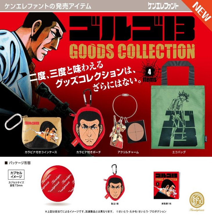 | 御予約受付中 | | 発売予定 | 3月発売 | | メーカー | ケンエレファント | | 商品名 | ゴルゴ13 グッズコレクション | | 仕様 | 400円カプセルトイ | | 入り数 | 30個入り | | カプセルサイズ | 73mm | | JANコード | | | 内容 | 受注締切日:2025年12月11日(木)午前7時【AM】になります。お早目のご予約お願いいたします! 400円カプセル。 ゴルゴ13のグッズコレクションが登場です! 全4種類 ・カラビナ付きコインケース ・カラビナ付きポーチ ・アクリルチャーム ・エコバッグ こちらの商品は、商品入荷時の1袋30個+正規台紙1枚、17%OFF¥12000→¥9959での販売となります。