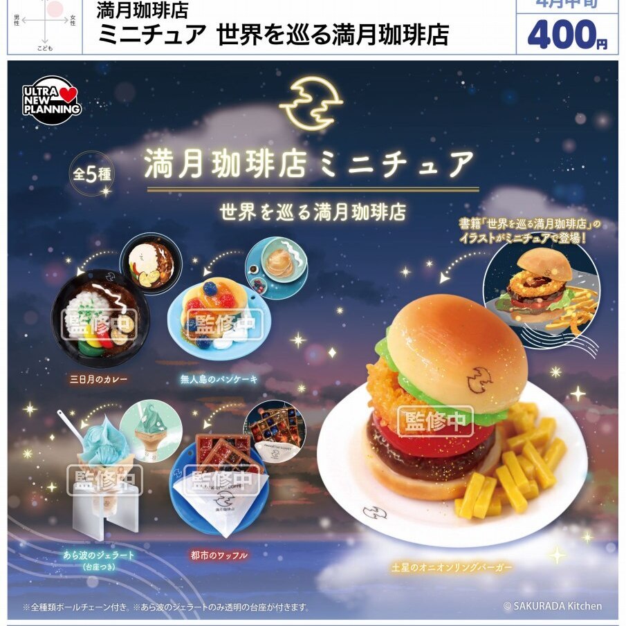 | 御予約受付中 | | 発売予定 | 4月発売 | | メーカー | ウルトラニュープランニング | | 商品名 | 満月珈琲店 ミニチュア 世界をめぐる満月珈琲店 (全5種) | | 仕様 | 400円カプセルトイ | | 入り数 | 30個入り | | カプセルサイズ | 65mm | | JANコード | | | 内容 | 受注締切日:2025年12月11日(木)午前7時【AM】になります。お早目のご予約お願いいたします! 400円カプセル。 イラストがミニチュアで登場!! ・土星のオニオンリングバーガー ・三日月のカレー ・無人島のパンケーキ ・あら波のジェラート ・都市のワッフル こちらの商品は、商品入荷時の1袋30個+正規台紙1枚、30%OFF¥12000→¥8399での販売となります。