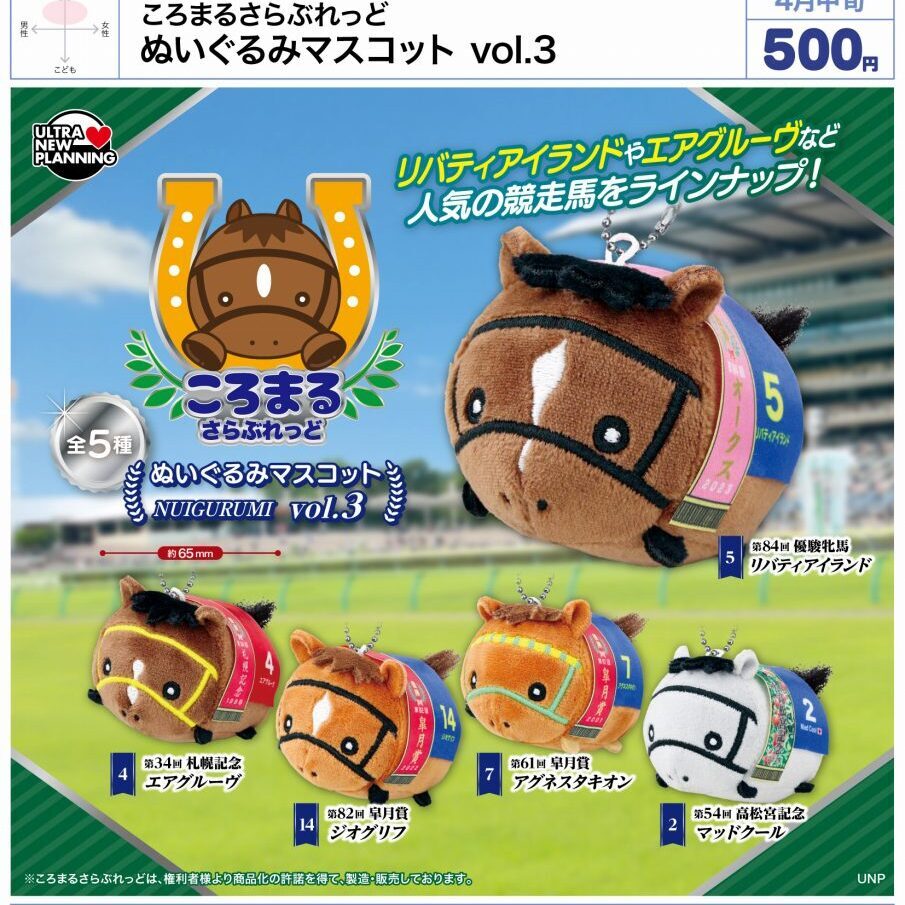 | 御予約受付中 | | 発売予定 | 4月発売 | | メーカー | ウルトラニュープランニング | | 商品名 | ころまるさらぶれっど ぬいぐるみマスコットvol.3 (全5種) | | 仕様 | 500円カプセルトイ | | 入り数 | 20個入り | | カプセルサイズ | 65mm | | JANコード | | | 内容 | 受注締切日:2025年12月11日(木)午前7時【AM】になります。お早目のご予約お願いいたします! 500円カプセル。 人気の競走馬をラインナップ!! ・リバティアイランド ・エアグルーヴ ・ジオグリフ ・アグネスタキオン ・マッドクール こちらの商品は、商品入荷時の1袋20個+正規台紙1枚、30%OFF¥10000→¥6999での販売となります。