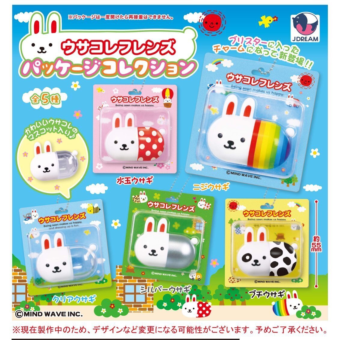 | 御予約受付中 | | 発売予定 | 4月発売 | | メーカー | (株)J・ドリーム | | 商品名 | ウサコレフレンズ パッケージコレクション (全5種) | | 仕様 | 400円カプセルトイ | 入り数 | 30個入り | | カプセルサイズ | 75mm | | JANコード |