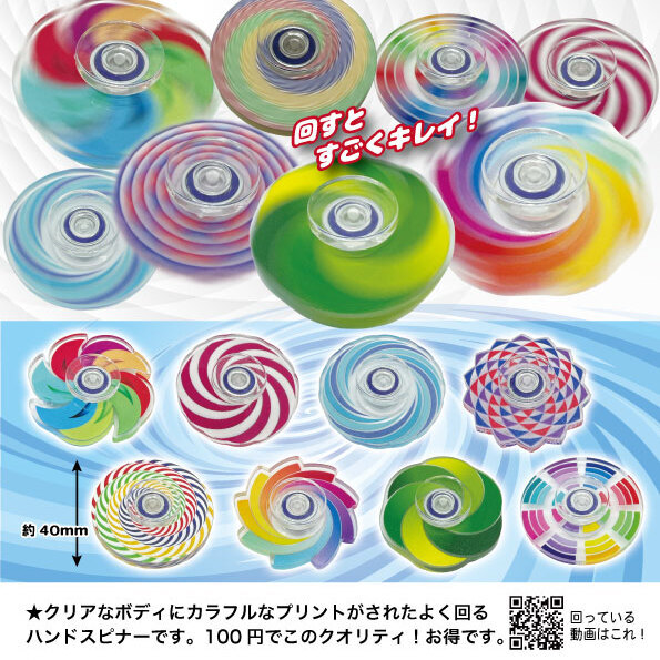 | 御予約受付中 | | 発売予定 | 3月発売 | | メーカー | 共同 | | 商品名 | スパイラルハンドスピナー (全8種) | | 仕様 | 100円カプセルトイ | | 入り数 | 100個入り | | カプセルサイズ | | | JANコード | | | 内容 | 受注締切日:2025年12月11日(木)午前7時【AM】になります。お早目のご予約お願いいたします! 100円カプセル。 クリアなボディにカラフルなプリントがされたよく回るハンドスピナーです!! こちらの商品は、商品入荷時の1袋100個+正規台紙1枚、28%OFF¥10000→¥7199での販売となります。