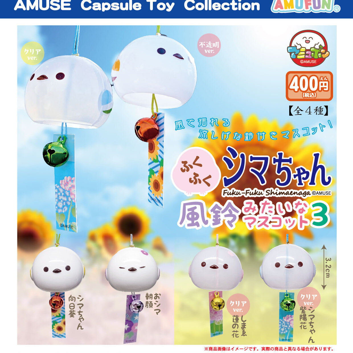 | 御予約受付中 | | 発売予定 | 5月発売 | | メーカー | アミューズ | | 商品名 | ふくふくシマちゃん風鈴みたいなマスコット3 (全4種) | | 仕様 | 400円カプセルトイ | | 入り数 | 30個入り | | カプセルサイズ | | | JANコード | | | 内容 | 受注締切日:2026年2月10日(火)午前7時になります。お早目のご予約お願いいたします! 400円カプセル。 全4種 風で揺れる涼しげな鈴付きマスコットです! ・シマちゃん 向日葵 ・おシマ 朝顔 ・しまゑ 蓮の花 ・シマちゃん 紫陽花 こちらの商品は、商品入荷時の1袋30個+正規台紙1枚、29%OFF¥12000→¥8579での販売となります。