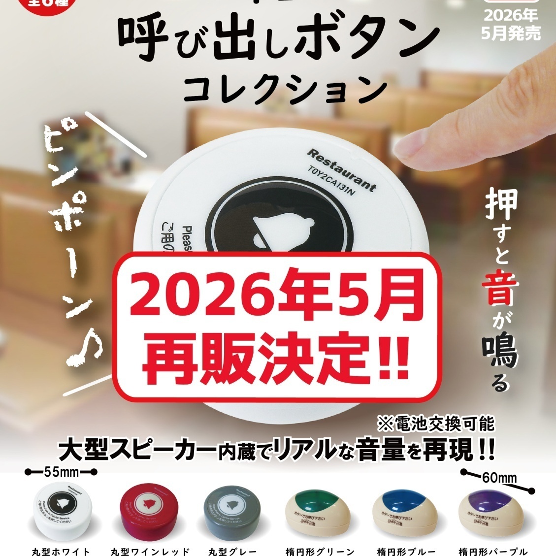| 御予約受付中 | | 発売予定 | 5月発売 | | メーカー | トイズキャビン | | 商品名 | 卓上呼び出しボタンコレクション | | 仕様 | 300円カプセル | | 入り数 | 40個入り | | カプセルサイズ | 65mm | | JANコード | | | 内容 | 受注締切日:2026年2月10日(火)午前7時【AM】になります。お早目のご予約お願いいたします! 300円カプセル。 人気のため再販決定です!