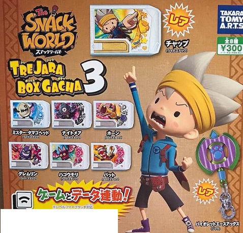 | メーカー | タカラトミーアーツ | | 商品名 | スナックワールド TRE JARA BOX GACHA3 (全8種) | | 内容 | ゲームとデータ連動!!第3弾が登場!!